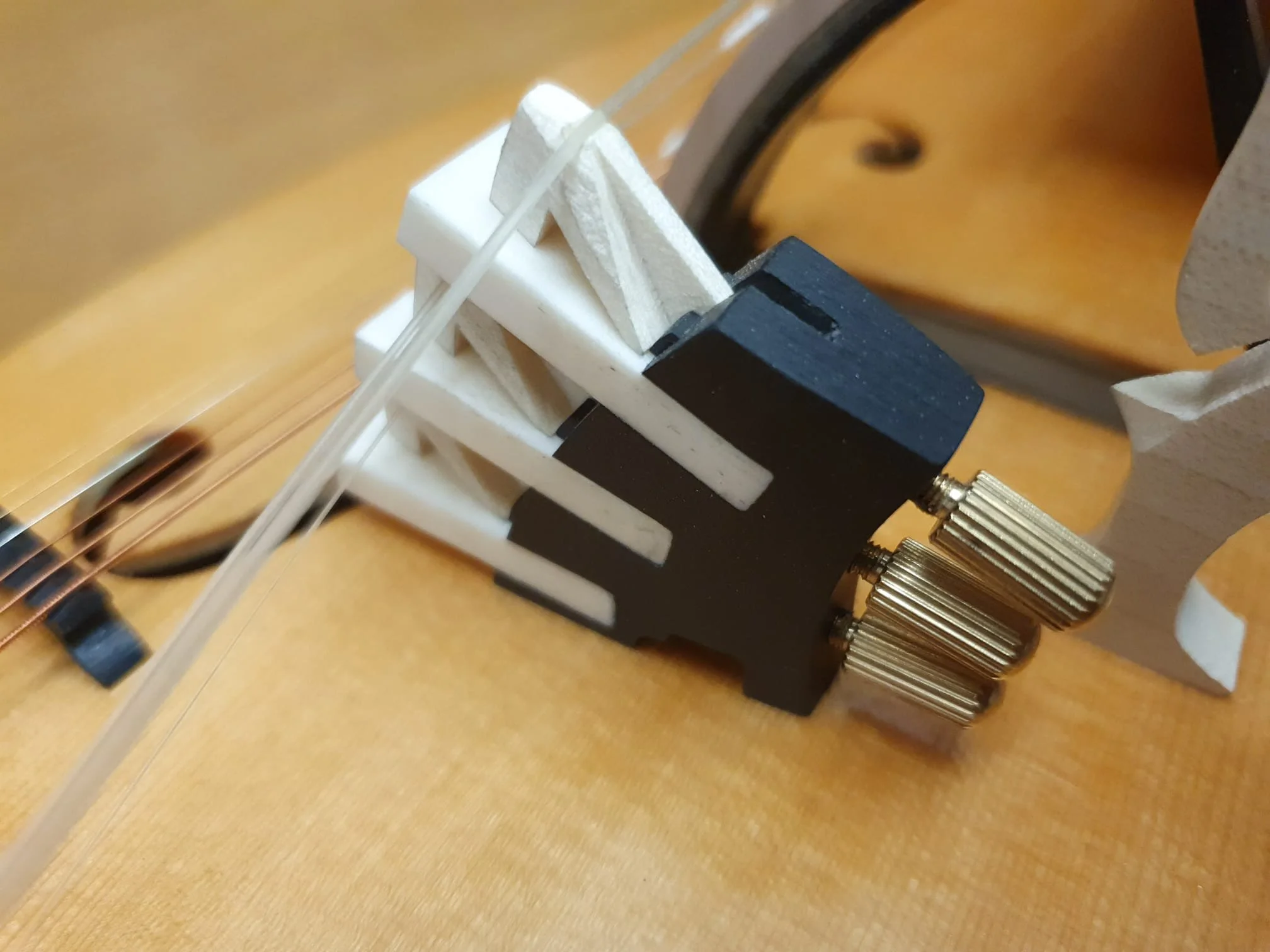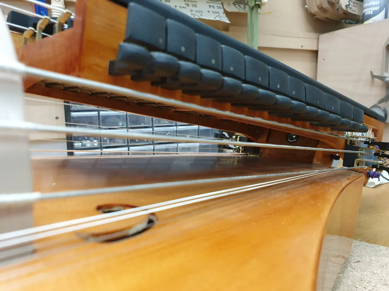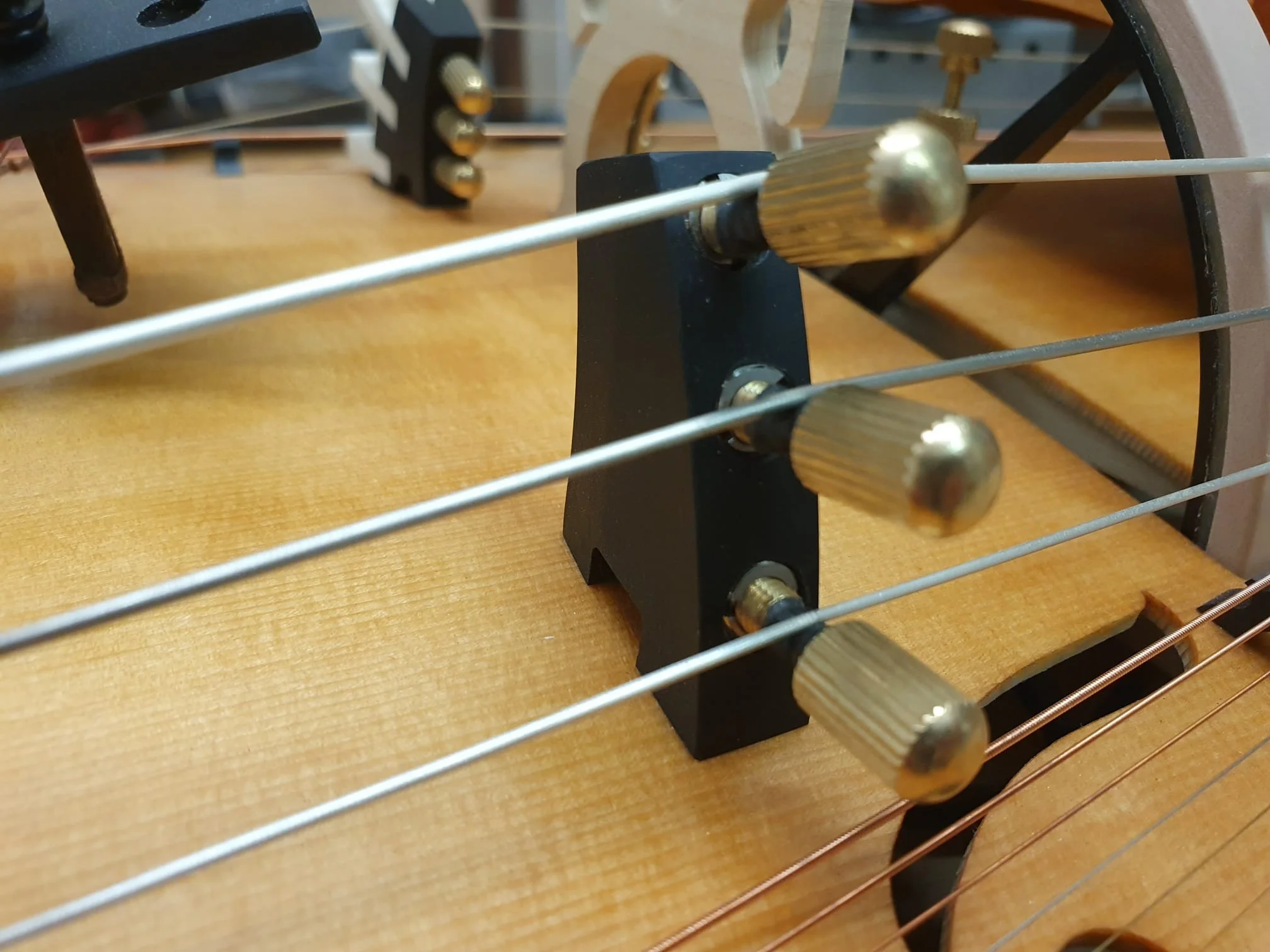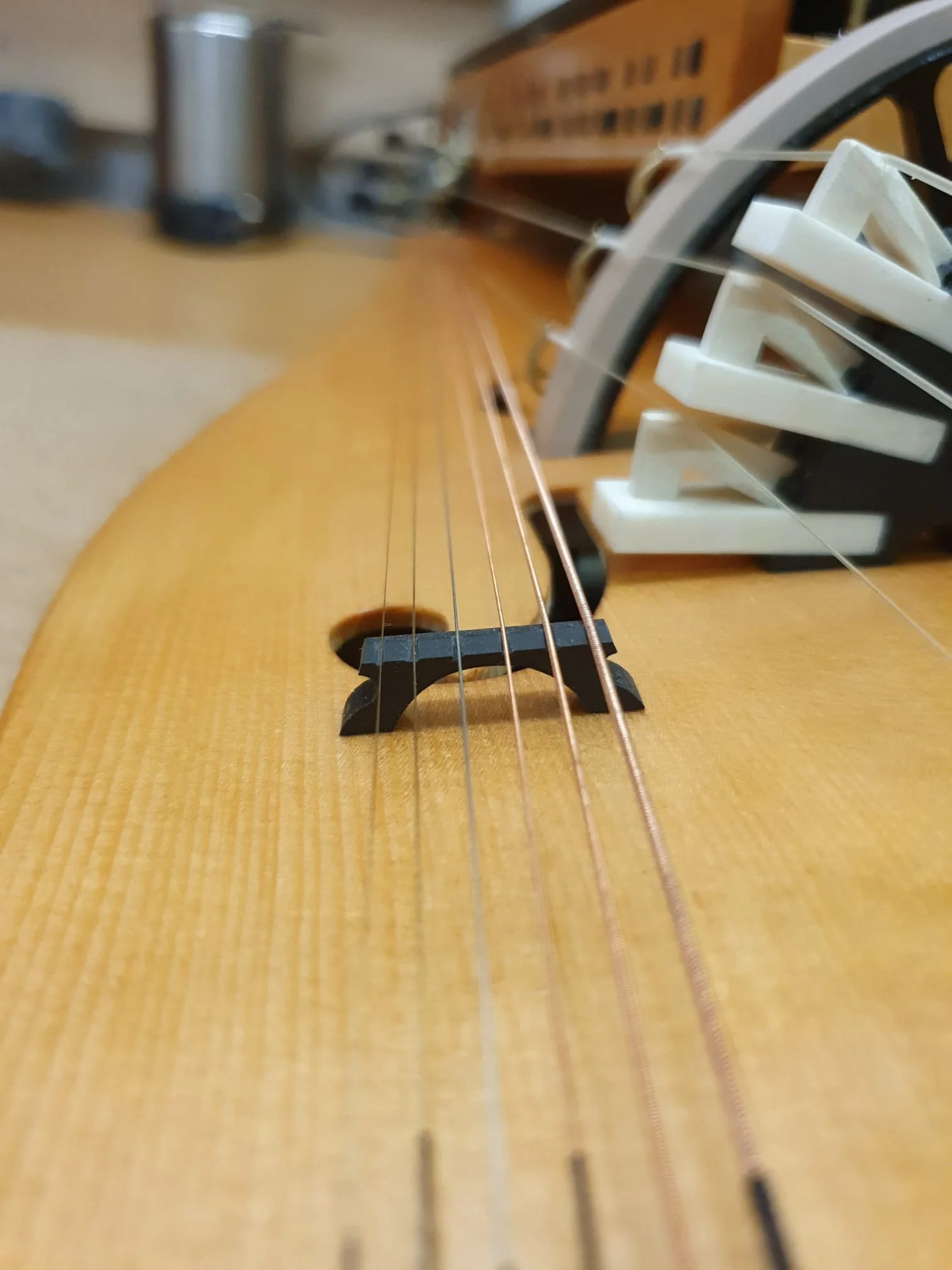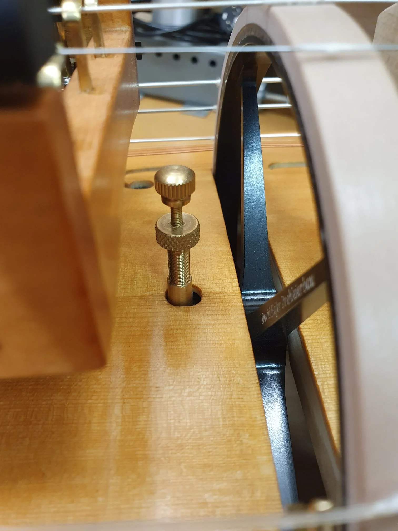 Unlike most Hurdy-Gurdies, the string hanger is not glued to the soundboard as usual, but to the rib of the DynRaL. This frees the soundboard from unnecessary mass.