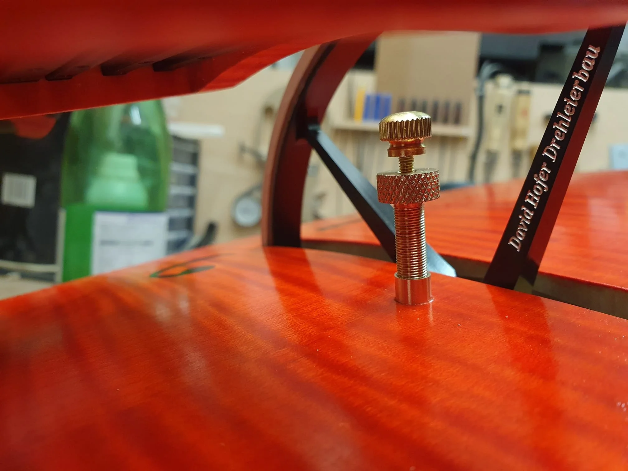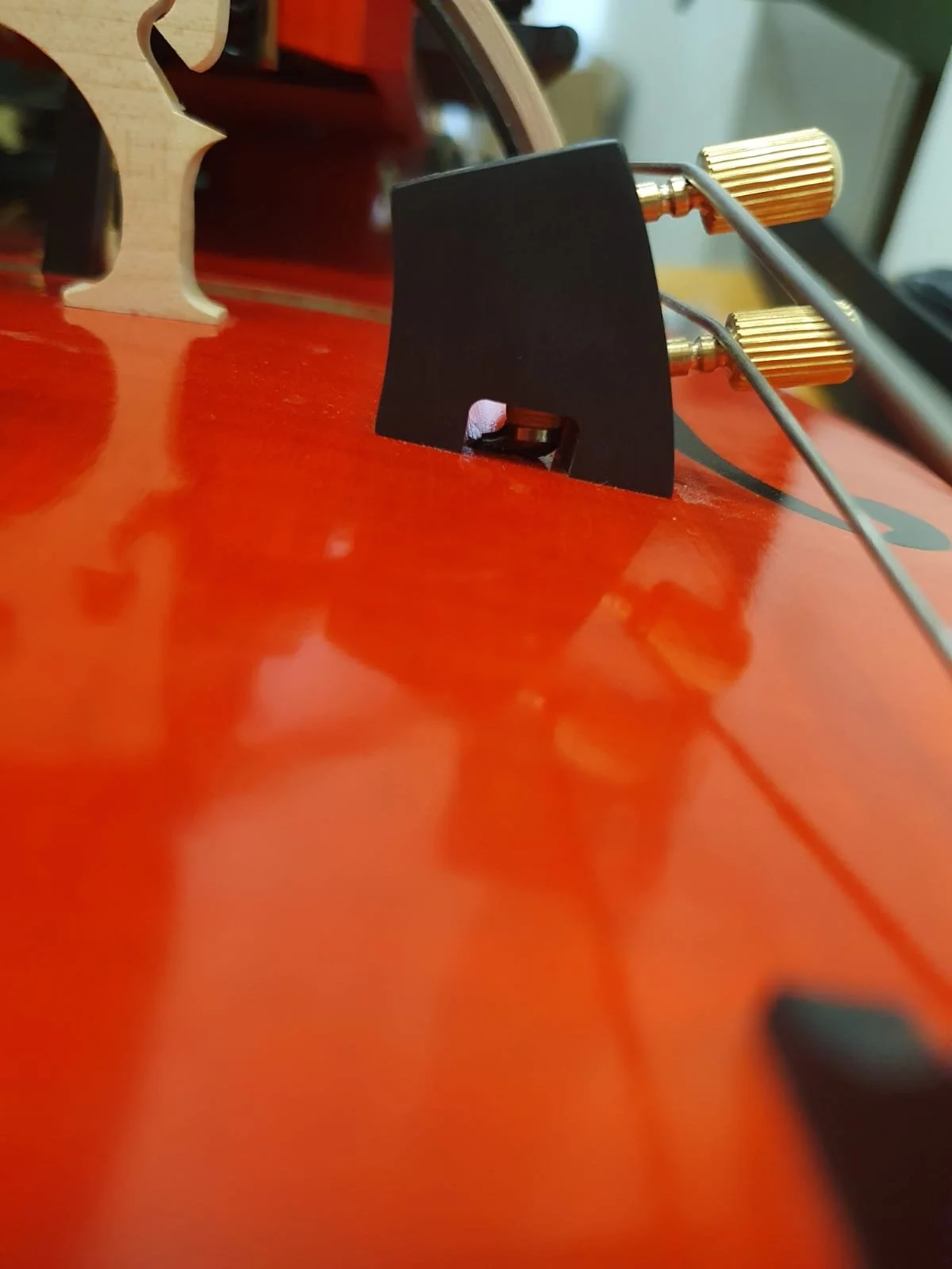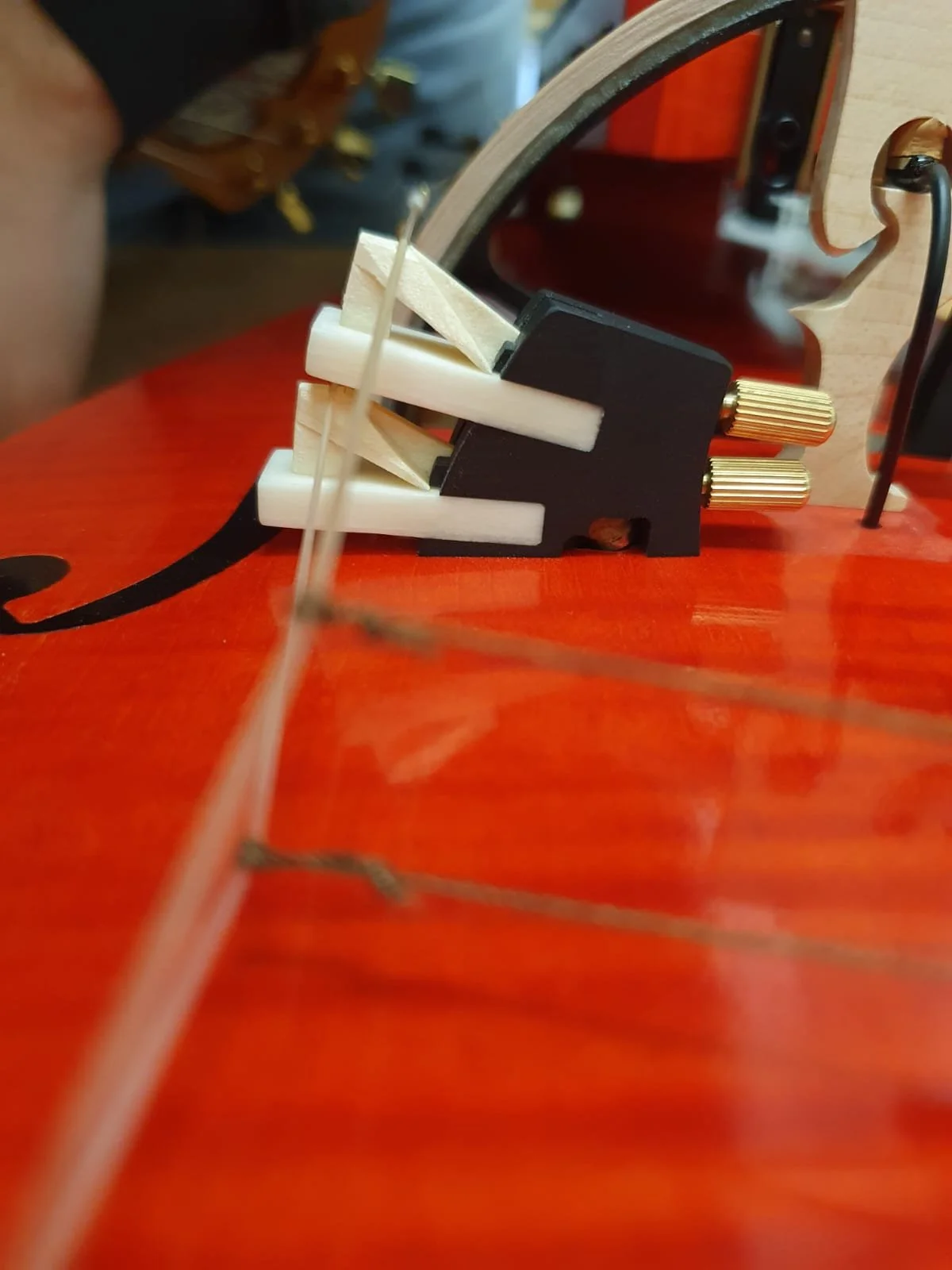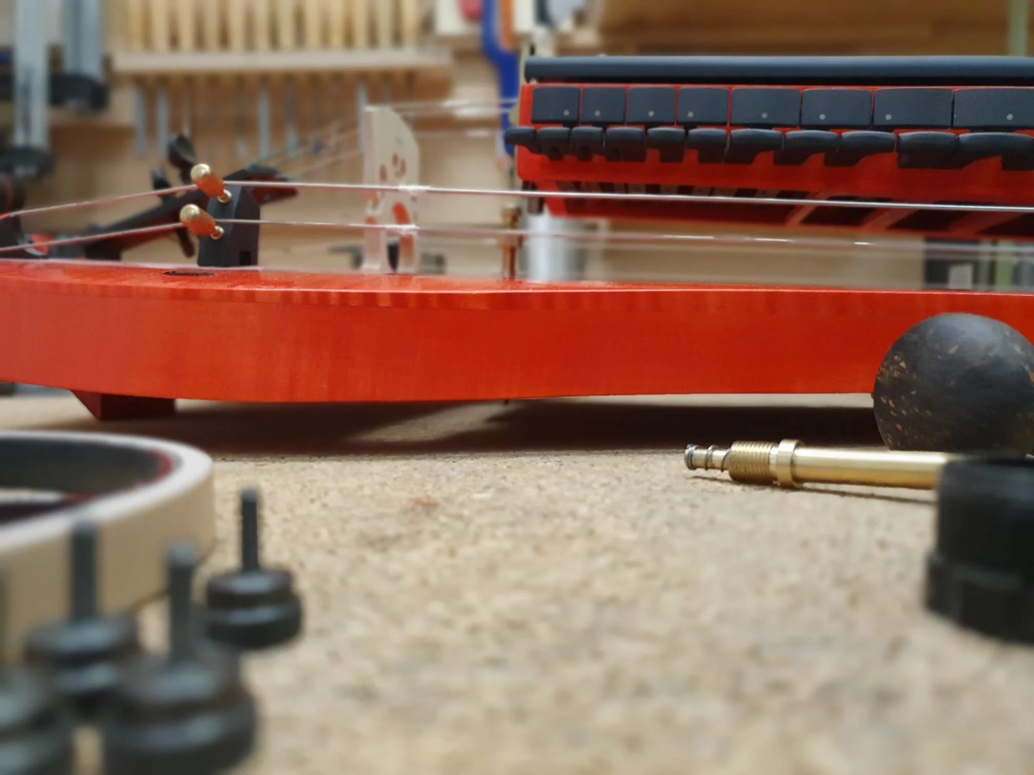 Unlike most Hurdy-Gurdies, the string hanger is not glued to the soundboard as usual, but to the rib of the DynRaL. This frees the soundboard from unnecessary mass.